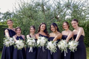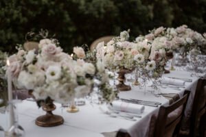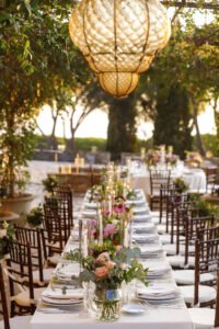 The table number six covered in a white tablecloth, set for a wedding reception with floral centerpiece featuring colorful flowers, and cups